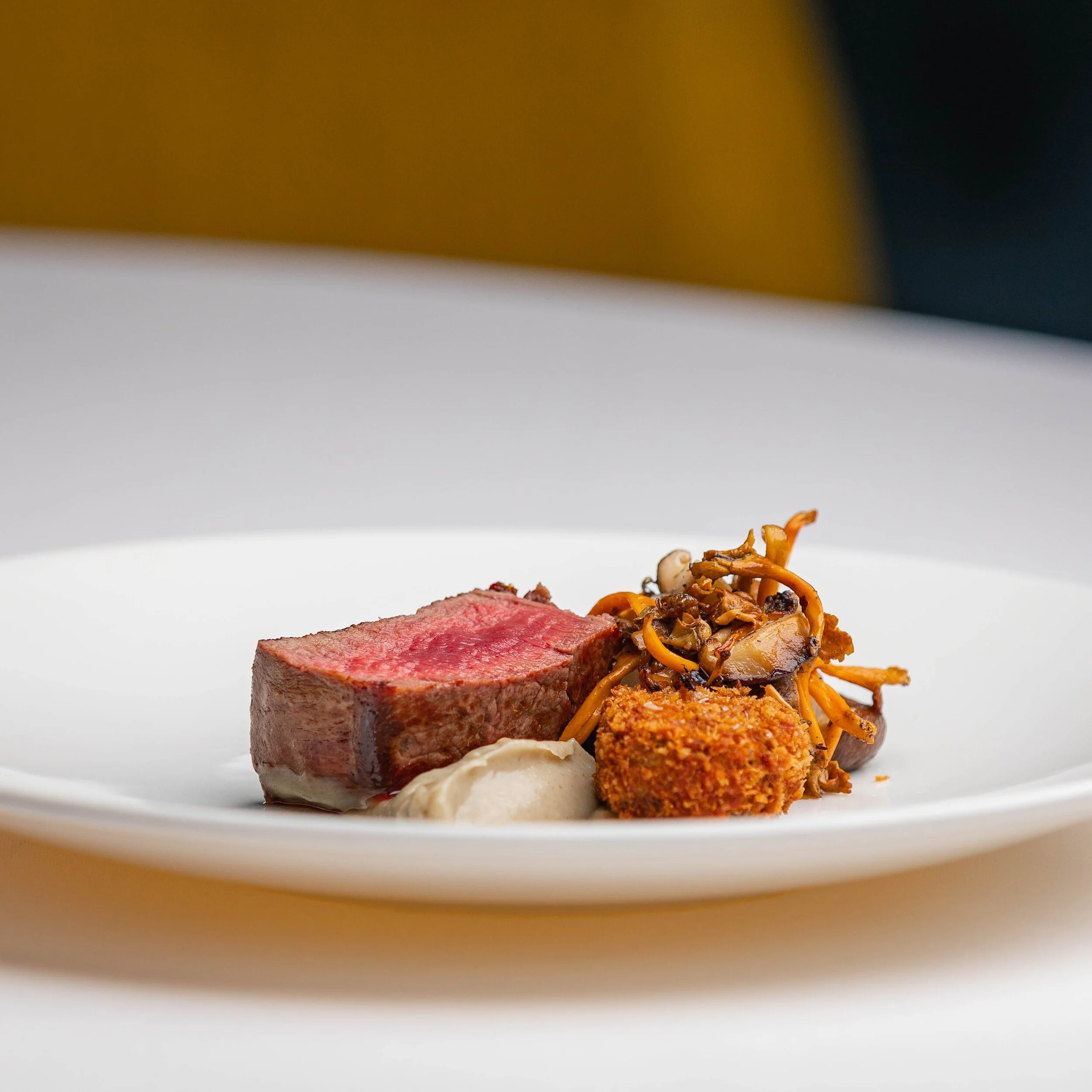 beef eye fillet with wasabi mash, fried enoki & cream sauce