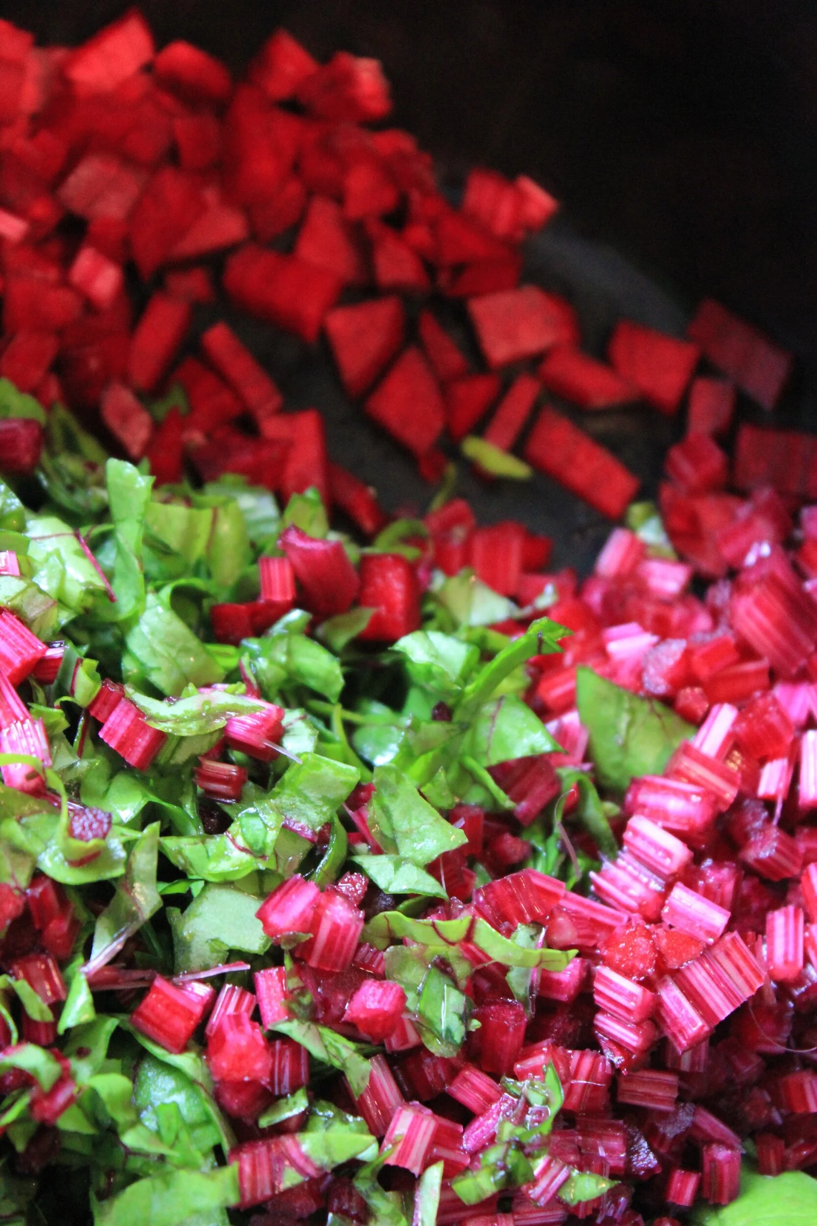 Arrange a bed of watermelon slices in a slight angled formation. Place cucumber and beetroot cubes on top.